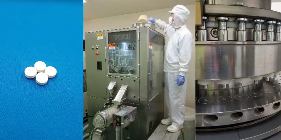 打錠加工とは、原料の粉末や造粒物を圧縮して成形する技術で、健康食品など幅広い分野で利用されております。原料を練合・乾燥・造粒し、打錠機にて打錠を行います。大量生産に向いておりますが、弊社では小ロットから対応しております。他の剤形に比べて比較的に安価で製造ができます。錠剤はコンパクトで平滑なため、飲みやすい剤形です。