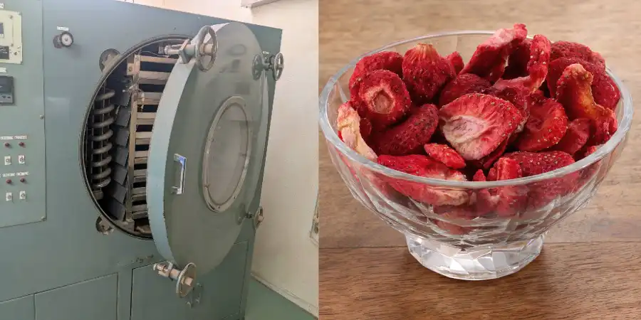 真空凍結乾燥加工(フリーズドライ)とは、原料の水分を凍結させ真空状態で乾燥させることにより、氷から直接水蒸気に変化させる技術を用いた乾燥加工です。真空凍結乾燥は、低温で乾燥させるため、熱に弱い成分や風味、原料の色や栄養素などが損なわれにくく、長期保存が可能になります。弊社では、1バッチで8枚のトレーを使用し、20kgほどの原料を仕込むことができます。【加工事例】いちご果肉、甘夏果汁、たまねぎ、パプリカなど